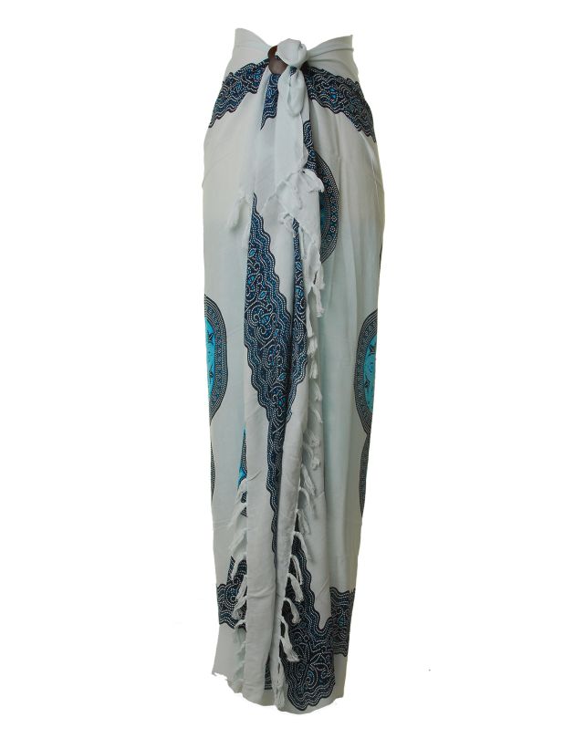 Sarong, pareo, hamamdoek kleur blauw wit bloemen print versierd met franjes. Ook te gebruiken als tafelkleed, wandkleed of muurdecoratie.